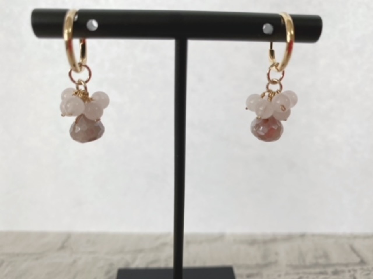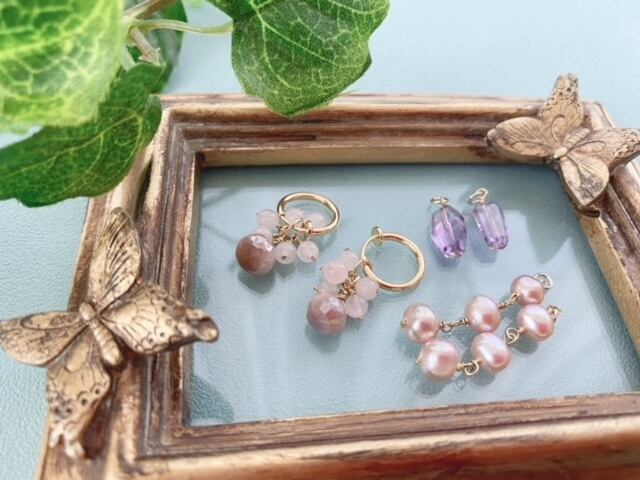 3つ目はムーンストーンとローズクオーツ、ぷっくらとしたカットが美しいドロップ型のムーンストーン、淡いピンクのローズクォーツを合わせ、コロンとして動きのあるかわいいパーツです。
