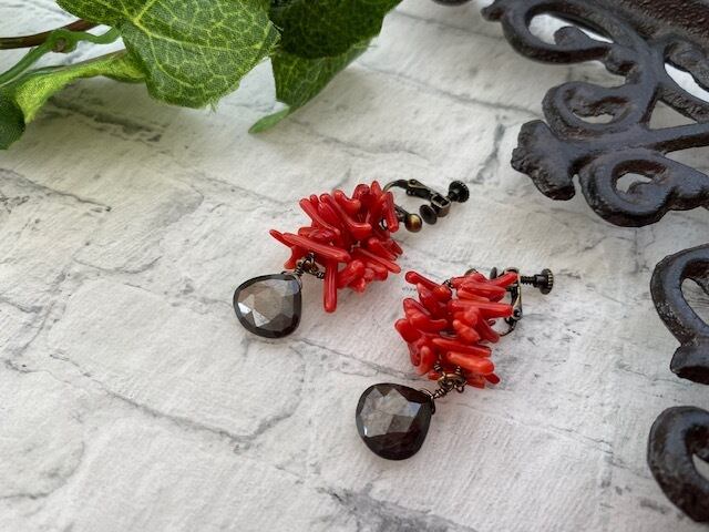 シックなブラックカラーをベースに金色に輝くシーラ、カットの反射がとても美しく輝くゴールデンシーンサファイア、サンゴと合わせたイヤリングです。