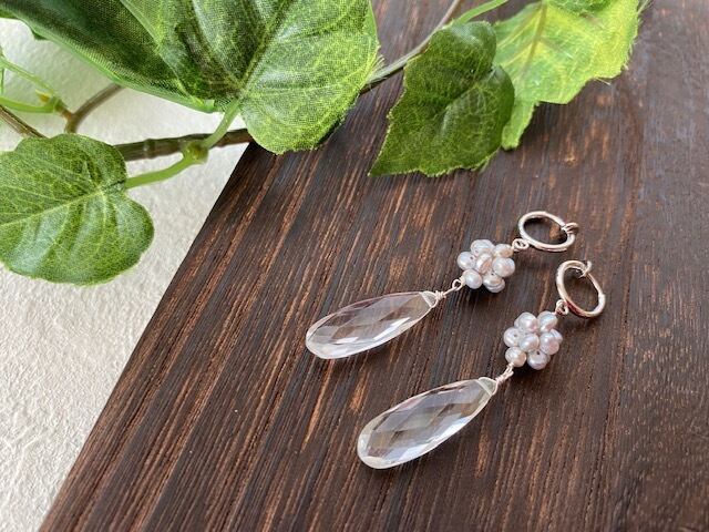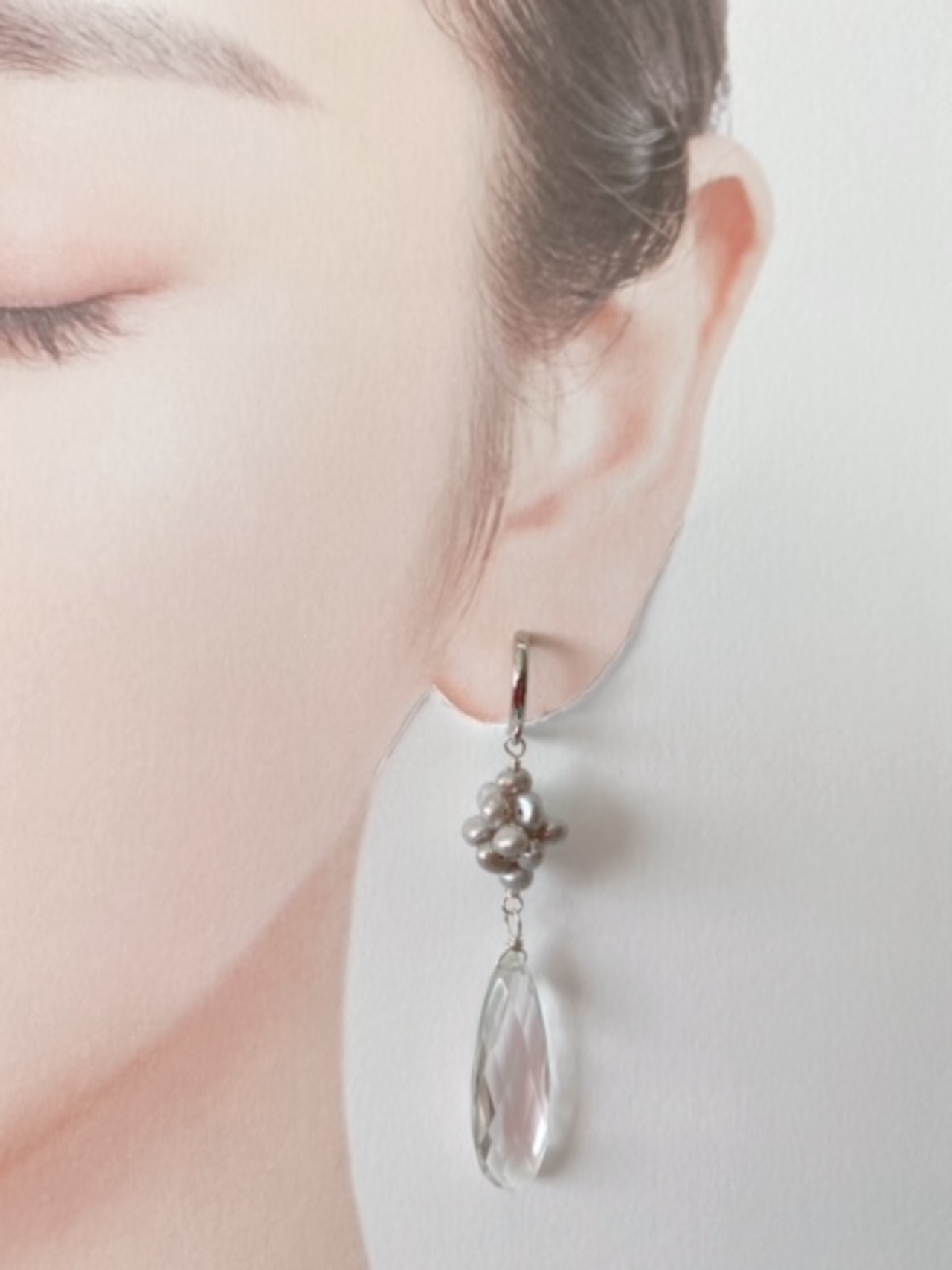 シルバーの小粒淡水パールと縦長のブリオットカットの水晶のイヤリングです。